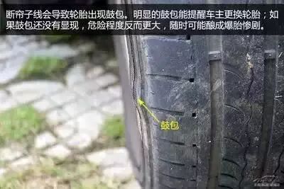 帘子线断裂的后果就是轮胎容易出现鼓包,意味着轮胎随时有爆胎的危险。可怕的是,很多时候鼓包并不会马上显现,而是潜伏在被挤成“内伤”的轮胎内,然后逐渐显现。假如车主继续使用有“内伤”的轮胎,不知道什么时候就会成为爆胎的牺牲品。可见,断帘子线是爆胎的最大诱因。