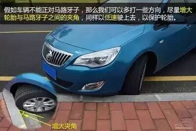 在实际操作的过程中,由于路况不同,有时候我们很难以上图所示的正确方法上马路牙子。这种时候,我们可以以下图的方法去应对: