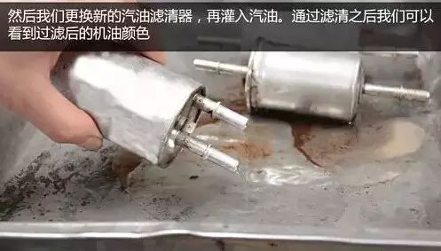 我们更换一个新的汽油滤清器做一个实验。从上图中我们可以看出添加进去的液体通过过滤后是非常的干 净,过滤效果非常的明显。通过对比,因为没有及时更换汽油滤可造成积碳、死火、动力下降、油耗增加等一系列问题,这些保养费用计算起来有多伤?