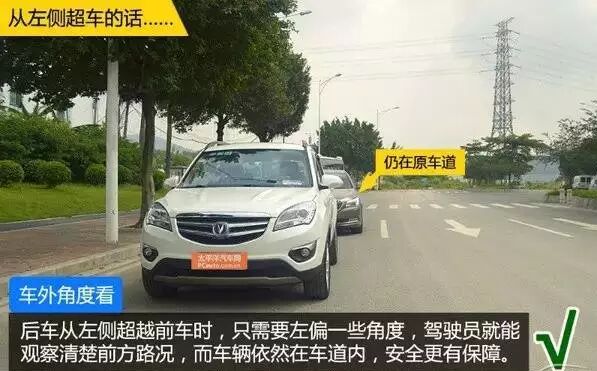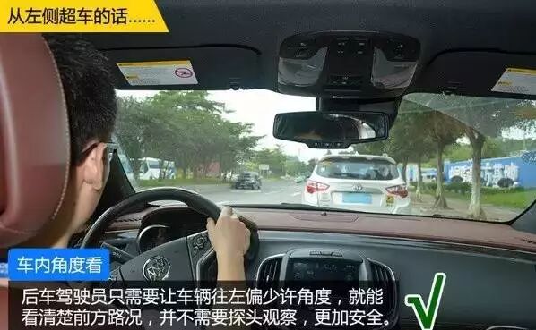 后车驾驶员若想从右侧超越前车,则必须将自己的车与前车往右错开,才能观察到前方的状况,判断是否可以超车。而从左侧超越前车,后车只需要在往左偏离车道最小的状况下,驾驶员就能观察到前方是否可以超车,更能确保安全。我们可以从以下四张图更直观地看出左侧超车的安全。
