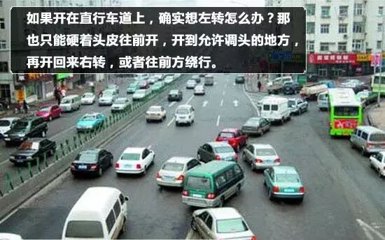 如果开在直行车道上,确实想左转怎么办?那也只能硬着头皮往前开,开到允许调头的地方,再开回来右转,或者往前方绕行。