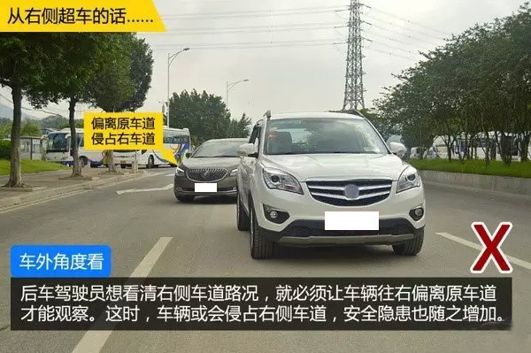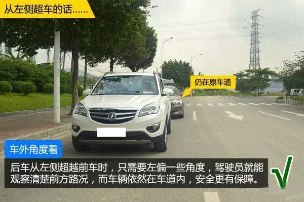 而从左侧超越前车,后车只需要在往左偏离车道最小的状况下,驾驶员就能观察到前方是否可以超车,更能确保安全。