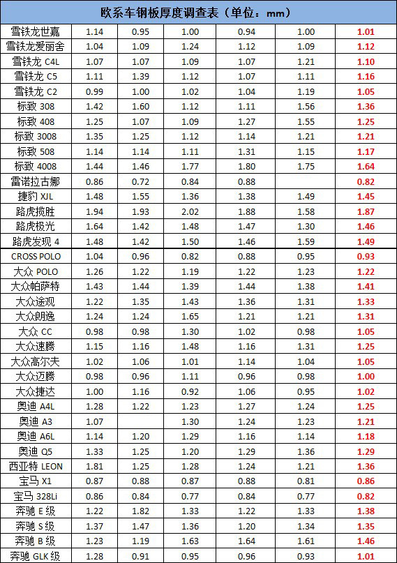此次调查涉及自主、欧系(包括英、法、德等)、日系、美系车共26个品牌、95款车型。根据有关《汽车工程手册》记载,车身外部件用于顶盖、车门、翼子板、行李箱盖、发动机盖等地方的钢板,一般厚度允许从0.8mm-2.0mm。所有车型的测试结果如下。