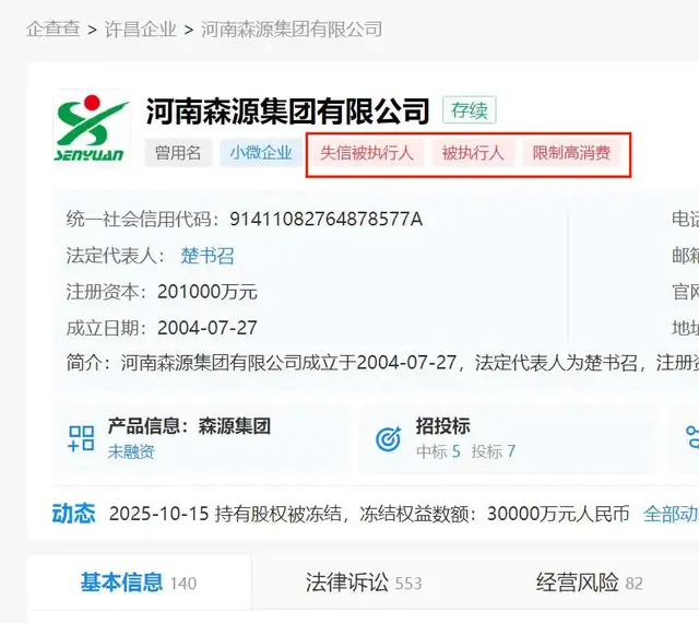 公开信息显示,自2020年以来,森源电气被质押股票多次被司法拍卖,森源集团多次被列为失信被执行人,被执行标的总金额高达几十亿元。与此同时,森源集团实际控制人楚金甫被列为失信被执行人,被限制高消费,79.55%的股权全部被冻结。在高额债务面前,森源电气无奈“委身”国资,以股权换求生。