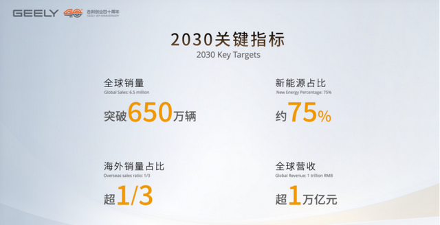 站在四十周年的节点上,吉利宣布2030年要实现乘用车加商用车全球总销量突破650万辆,营收超1万亿元,跻身全球车企销量前五。以2025年411.6万辆的销量为基盘,要实现五年后650万辆的目标,年均复合增长率需维持在9.5%左右。在行业增速普遍放缓的今天,这是一个不折不扣的挑战。