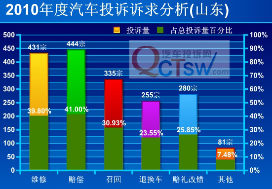 报告显示,汽车投诉网在2010年度累计接到投诉9766宗。而来自山东的投诉为1110宗,其中27宗由于资料不全或恶意投诉被判为无效投诉,实际有效投诉为 1083 宗,占汽车投诉网总投诉量的11.09%。