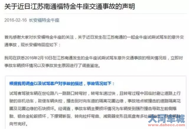 2月16日下午18:00左右,长安福特官方发表了一篇《关于近日江苏南通福特金牛座交通事故的声明》,称:“此次断轴是因为试驾者转弯车速过快,撞击到隔离花圃边缘的石块造成的。”