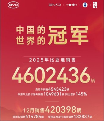 2025 年起,比亚迪于全球新能源汽车市场全面提速、强势进击,全年新能源汽车累计销量高达 460.2 万辆,其中,纯电动车型销量劲收 225.7 万辆,同比增幅达 27.86%,连续5个季度超越特斯拉,以硬核实力加冕全球纯电市场 “新王”,正式从“追赶者”变身为“领跑者”。