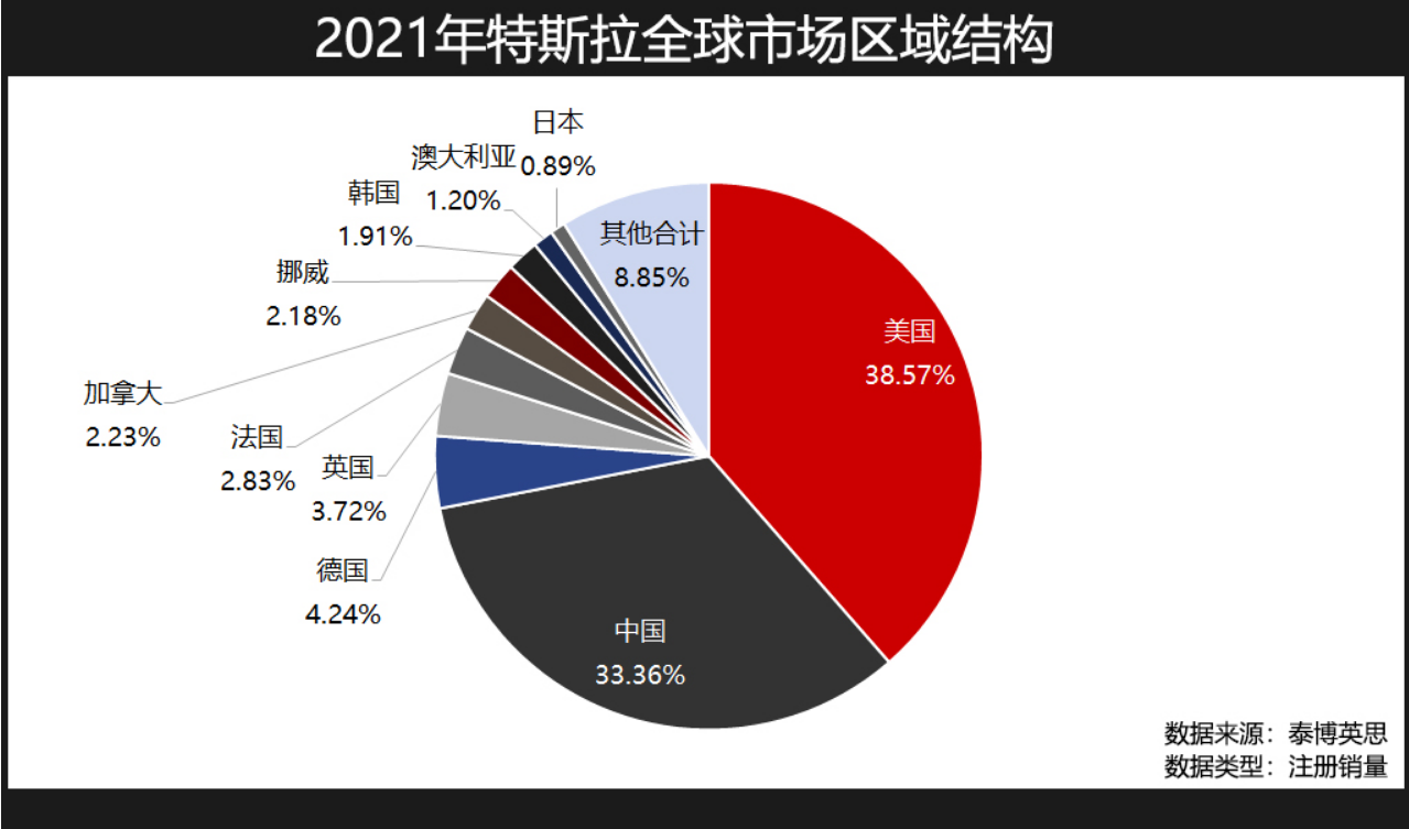 具体到细分市场上,目前美国仍是特斯拉最大的全球市场,占比达到38.57%;其次是中国市场,超过三分之一的比重,同样贡献出了重要力量。此外,在德国、英国、法国等燃油车企强国中,特斯拉也占据了一定的市场份额,当特斯拉德国工厂投入使用后,或许会覆盖更多欧洲国家。