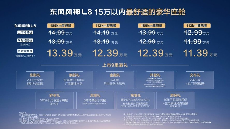 8月29日,东风风神L8在成都车展上市,限时置换价11.39万元起,叠加国/地补后价格直逼底线。这款车被定义为“15万以内最舒适的豪华座舱”,不仅用“冰箱彩电大沙发”的豪车配置颠覆了行业认知,更向市场抛出一个问题:十多万的家用车,凭什么不能一步到位?