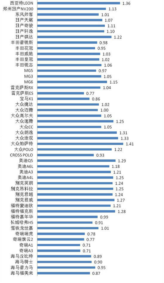 日系车并非钢板都很薄,整体表现要好于自主品牌。但若以1.2mm厚度为线进行划分,我们可以看到,分界线以下多数为自主品牌和日系车,而欧系车和美系车则几乎都处于分界线上方。因此,日系车钢板较薄而德系美系车钢板相对较厚这一观点并非无中生有,我们的检测结果也证明了这一点。自主品牌和日系车仍然有待提高。