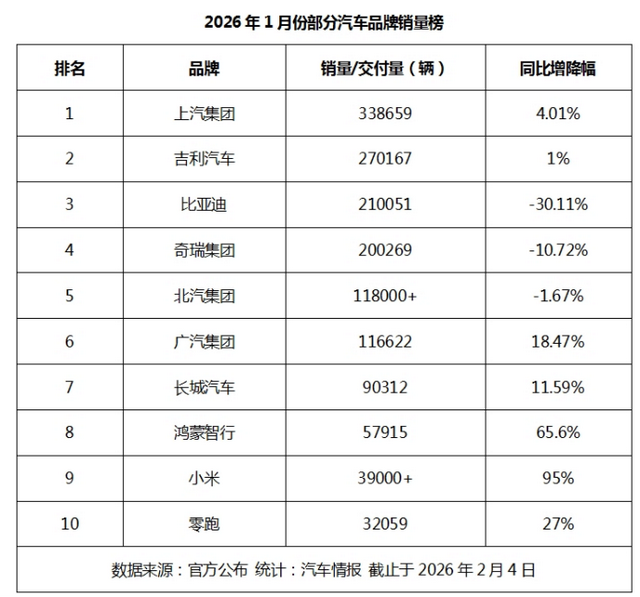 然而,当2026年的第一个月刚刚翻页,现实却上演了一幕令人费解的“反转剧”。各大车企1月份的销量数据陆续出炉,呈现出一派与预警截然不同的景象。据汽车情报新媒体统计,截至2026年2月4日,在已公布当月销量数据的、位居行业前列的十家车企中,竟有七家实现了同比正增长,出现下滑的仅为三家。