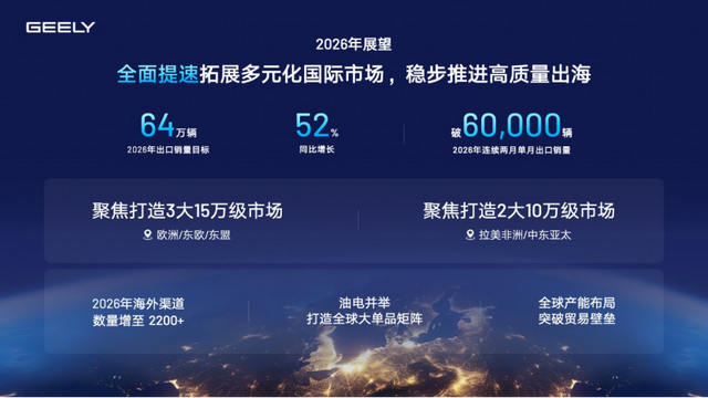 2026年,吉利计划在全球打造3个15万级区域市场(欧洲、东欧、东盟)和2个10万级市场(中东亚、拉美非),海外销量内部目标锚定75万辆,增幅超过50%。这个目标的背后,是吉利从“卖车”到“建体系”的战略升级。