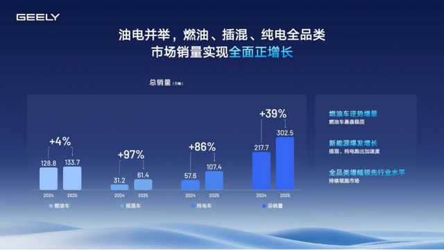 但更值得关注的是,吉利的燃油车业务,依然稳如磐石。2025年,“中国星”系列年销121万辆,稳居自主品牌燃油车第一。在燃油车依然占据半壁江山的情况下,吉利用燃油车的利润,去支撑新能源的研发和推广。