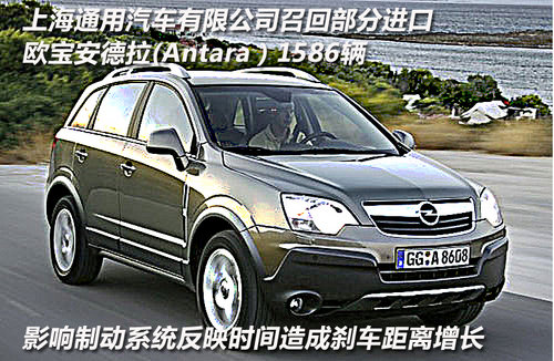通用汽车(中国)投资有限公司、上海通用汽车有限公司向国家质量监督检验检疫总局递交了召回报告,因防抱死制动系统(ABS)缺陷,自2012年3月7日起分别召回部分进口欧宝安德拉(OPEL Antara)汽车和进口雪佛兰科帕奇(CHEVROLET CAPTIVA)汽车。据两家公司统计,在中国大陆地区共涉及进口欧宝安德拉1586辆,进口雪佛兰科帕奇16618辆,车辆生产日期为2006年4月11日到2009年11月9日。