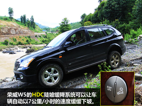 此次的山路试驾,我们遇到了一条倾斜角几乎接近40度角的上坡。只要将驱动模式调节到高动力四轮模式(4L),荣威W5征服这样的坡道还是不在话下的。重点在于下坡,湿滑的下坡路面上布满了碎石,所幸的是,我只要双脚离开刹车和油门,握紧方向盘就可以了,荣威W5的HDC陡坡缓降系统可以让车辆自动以7公里/小时的速度缓缓下坡。