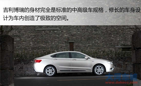 博瑞的颜值是颇高的。全新的回纹进气格栅柔和了水珠滴落水面时所带起的涟漪的设计,动中带静,巧妙地由此带出吉利博瑞既讲究沉稳大气,又不乏动感的形象。贯穿全车的腰线有力地表达了整车的力量感,尤为令人惊叹的是,吉利博瑞借鉴了世界潮流的轿跑元素,大角度的C柱设计巧妙地与车位融为一体,这种快溜式的设计完全把吉利博瑞蓄势待发的形象表现无遗,配以18英寸的多幅式轮毂。乍一看,整台车的力量感呼之欲出。