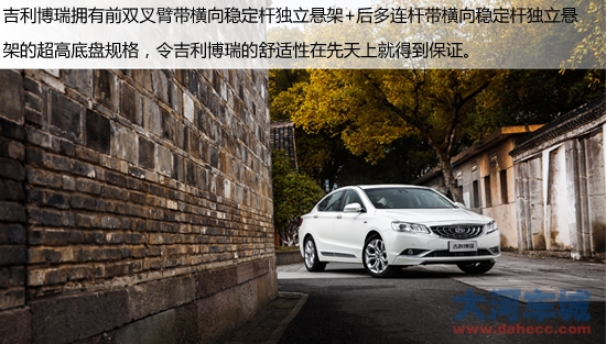 据了解,吉利博瑞拥有前双叉臂带横向稳定杆独立悬架+后多连杆带横向稳定杆独立悬架的超高底盘规格,令吉利博瑞的舒适性在先天上就得到保证,不同于对手简单的麦弗逊前悬挂,后双摇臂悬挂的规格,吉利博瑞的底盘配置能精确控制车轮上下运动轨迹,使前轮贴地性更佳,即便在豪华车上,这样高规格的底盘也并不常见。